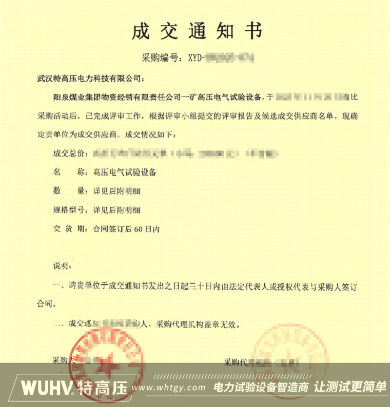 近日,武漢特高壓正式收到《成交通知書》,確認中標陽泉煤業集團物資經銷有限責任公司一礦高壓電氣試驗設備采購項目。這一成果的背后,是武漢特高壓團隊對客戶需求的精準把握、對投標流程的嚴謹執行以及對服務質量的不懈追求。